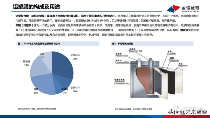 铝塑复合膜(简称铝塑膜)是锂离子电池专用封装材料,常用于软包电池和刀片电池中。单片电芯在组装后密封在铝塑膜当中,形成一个电池。铝塑膜起到保护 内部电极、隔绝外界环境的作用。在软包锂电池中,铝塑膜占总材料成本10-20%,仅次于正极材料和隔膜,目前技术壁垒高、国产化率低。