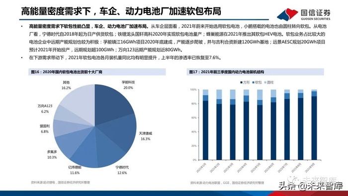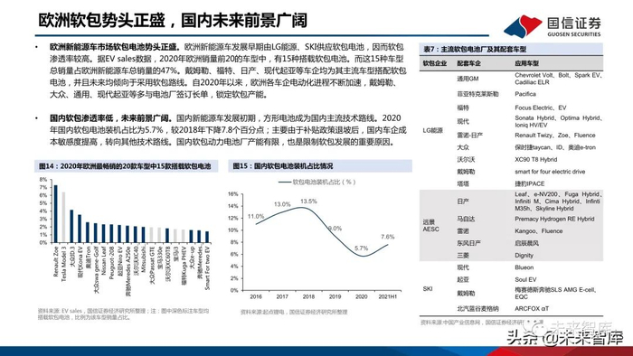 欧洲新能源车市场软包电池势头正盛。欧洲新能源车发展早期由LG能源、SKI供应软包电池,因而软包 渗透率较高。据EV sales数据,2020年欧洲销量前20的车型中,有15种搭载软包电池。而这15种车型 总销量占欧洲新能源车总销量的47%。戴姆勒、福特、日产、现代起亚等车企均为其主流车型搭配软包 电池,并且未来均倾向于采用软包路线。自2020年以来,欧洲各车企电动化进程不断加速,戴姆勒、 大众、通用、现代起亚等多与电池厂签订长单,锁定软包产能。国内软包渗透率低,未来前景广阔。国内新能源车发展初期,方形电池成为国内主流技术路线。2020 年国内软包电池装机占比为5.7%,较2018年下降7.8个百分点;主要由于补贴政策退坡后,国内车企成 本敏感度提高,转向其他技术路线。国内软包动力电池厂产能有限,也是限制软包发展的重要原因。