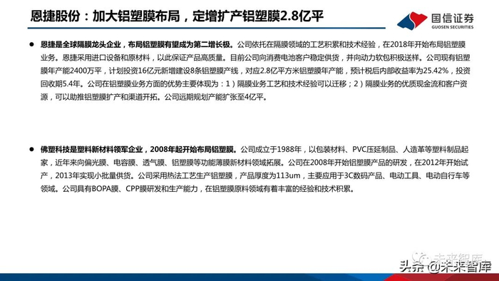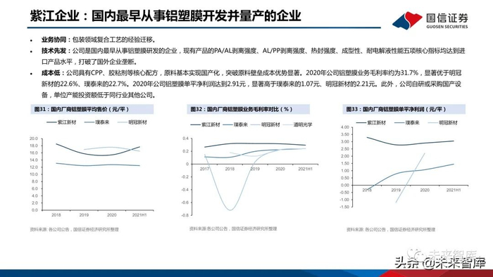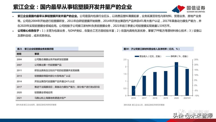 紫江企业是国内最早从事铝塑膜开发并量产的企业。公司是国内包装行业巨头,以消费品塑料薄膜起家,业务拓展至软包与新材料、贸易业务、房地产业务 等。公司在2004年开始进行铝塑膜研发,2011年自研铝塑膜开始销售,2014年开发出第四代产品并获ATL等大客户认证,2017年具备动力膜生产能力,并 在2020年实现铝塑膜全领域应用。公司控股子公司紫江新材料负责铝塑膜业务,2021年前三季度公司铝塑膜实现销量1,539万平。公司核心优势在于:1)主营为包装业务,与DNP类似,在复合工艺方面经验丰富;2)在国内具有先发优势,掌握了PP配方等原材料核心技术;3)设备以 及原料自给,成本优势突出。