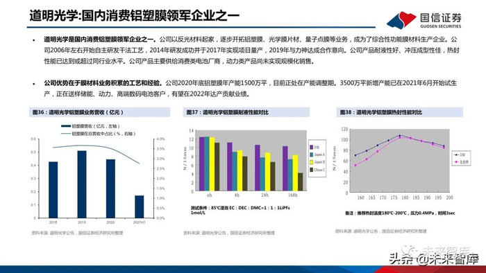 道明光学是国内消费铝塑膜领军企业之一。公司以反光材料起家,逐步开拓铝塑膜、光学膜片材、量子点膜等业务,成为了综合性功能膜材料生产企业。公 司2006年左右开始自主研发干法工艺,2014年研发成功并于2017年实现项目量产,2019年与力神达成合作意向。公司产品耐液性好、冲压成型性佳,热封 性能已达到或超过同行业水平。公司产品主要供给消费类电池厂商,动力类产品尚未实现规模化销售。公司优势在于膜材料业务积累的工艺和经验。公司2020年底铝塑膜年产能1500万平,目前正处在产能调整期。3500万平新增产能已在2021年6月开始试生 产,正在送样储能、动力、高端数码电池客户,有望在2022年达产贡献业绩。