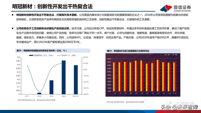 业务协同:包装领域复合工艺的经验迁移。技术先发:公司是国内最早从事铝塑膜研发的企业,现有产品的PA/AL剥离强度、AL/PP剥离强度、热封强度、成型性、耐电解液性能五项核心指标均达到进 口产品水平,打破了国外企业垄断。成本低:公司具有CPP、胶粘剂等核心配方,原料基本实现国产化,突破原料壁垒成本优势显著。2020年公司铝塑膜业务毛利率约为31.7%,显著优于明冠 新材的22.6%、璞泰来的22.7%。2020年公司铝塑膜单平净利润达到2.91元,显著高于璞泰来的1.07元、明冠新材的2.21元。此外,公司自研或采购国产设 备,单位产能投资额低于同行业其他公司。