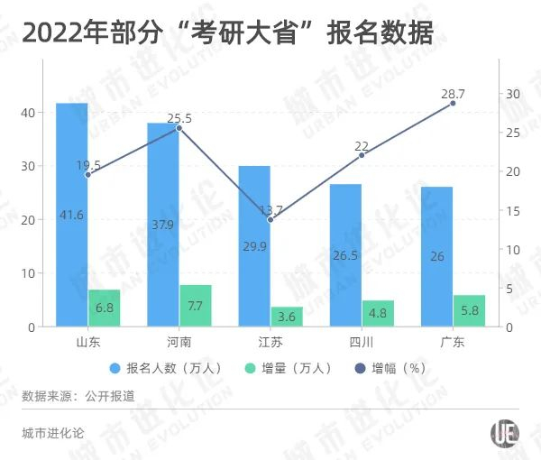 以2022年研考为例。仅山东、河南、江苏、四川4个省份,就占据全国研考报名总人数近3成,相比2021年均实现两位数增长。