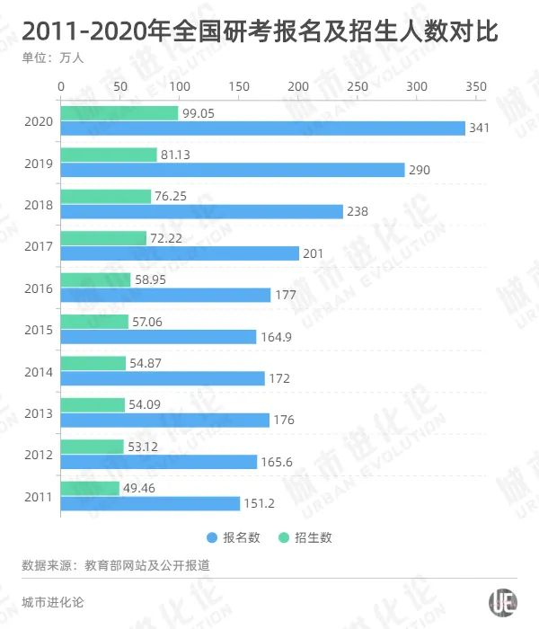 公开数据显示,在2011~2020年的10年间,全国研究生报考人数从151.2万增至341万,增量和增幅分别达到189.8万、125%;高等学校(机构)硕士研究生招生人数从49.46万人增至99.05万,增量和增幅分别为49.59万、100%,明显少于前者。
