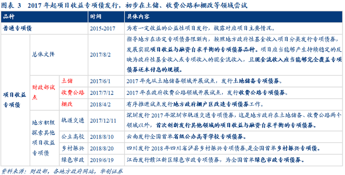(2)2017年-2018年:项目收益专项债出现并逐步成为主流。2017年起我国逐步建立专项债与项目资产、收益对应的制度,专项债项目需满足现金流收入完全覆盖专项债还本付息规模的要求,发行项目收益与融资自求平衡的专项债券;财政部首先开放土储、收费公路、棚改等具有稳定预期收益领域的试点;地方积极探索发行其他项目收益专项债,轨道交通、公立高校、乡村振兴等项目收益专项债陆续落地。