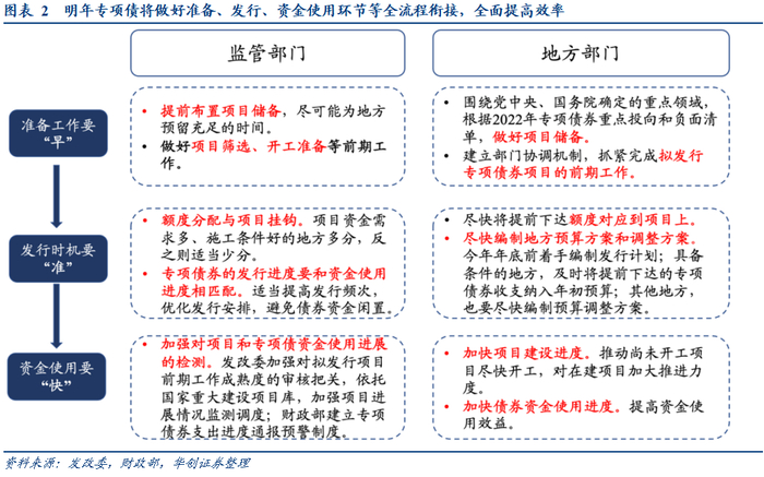 2、目前政策重心在于提高专项债发行使用的全流程衔接效率。具体体现为准备工作要“早”、发行时机要“准”、资金使用要“快”。