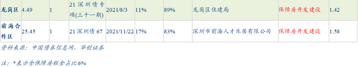 (3)偿债带来的流动性压力有所降低。一方面,发行期限在拉长。2018-2019年保障房专项债发行期限在10年及以下;2020年11月,财政部发布《关于进一步做好地方政府债券发行工作的意见》一文,指出专项债发行期限要坚持与项目期限相匹配的原则,由于保障房项目回款周期较长,2021年保障性租赁住房专项债发行期限基本上为15年和20年期,较前期大幅上升。另一方面,近期发行成本有所降低。2021年6月,部分地区对地方债发行利率进行下调,相对于国债的加点幅度下行突破前期政策指导的25bp;2021年11月,深圳市发行的保障性租赁住房专项债发行利差均下调至15bp,有利于降低保障房项目筹措专项债资金付出的的融资成本。