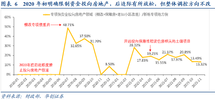 (2)2020年中旬以来:棚改专项债重启,但主要投向存量项目,对新开工项目的支持仍受限。2020年7月,为防止出现“半拉子”项目,棚改专项债重启发行,专项债投向房地产领域的占比快速回升,但由于仅支持已开工项目,且不得用于货币化安置项目,后续占比呈回落趋势;2021年以来,棚改专项债仍主要支持在建收尾项目,适度支持新开工项目,投向仍面临限制。