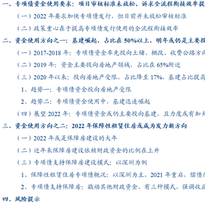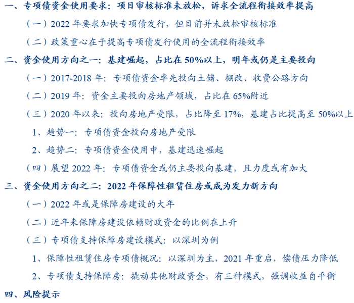 总结全文,(1)短期政策重心在于提高专项债准备、发行、资金使用等环节的全流程衔接效率,明年提前批地方债发行放量或无碍,往后的供给节奏仍需关注监管对项目建设和专项债资金使用进度要求的边际变化;(2)2022年专项债资金或仍主要投向基建领域,对“十四五”规划、水利和城市管网等基建项目的支持力度或进一步加大,叠加“资金使用效率”要求不改,利于提高专项债对基建投资的拉动效果;(3)尽管专项债资金投向棚改、土储等房地产项目仍受限,但可通过多种模式支持保障房建设,2022年是租赁住房建设的大年,且保障房项目较基建项目收益情况或更稳定,关注项目供给放量引发相关专项债扎堆发行的可能。