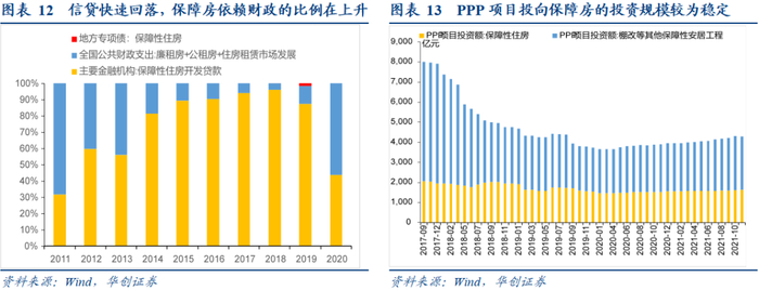 (2)财政资金:始终维持一定规模,近年有所发力。财政资金支持保障房建设始终维持一定规模,近年在住房租赁试点开展后有所发力,2020年一般公共预算资金投向保障房(廉租房、公租房和住房租赁市场发展)规模回升至500亿附近,约占投向全部保障性安居工程的16%;2018年以来专项债投向保障性安居工程方向的规模在2.1万亿附近,其中棚改专项债占90%,虽然投向保障房的存量规模较小,但仍在持续加速放量。