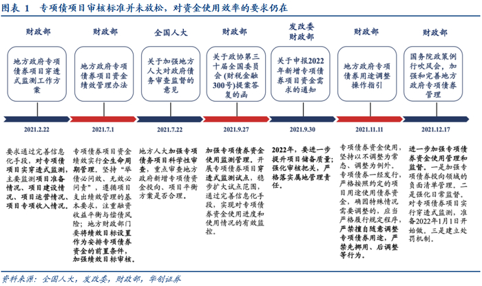 1、2022年要求加快专项债发行,但目前并未放松审核标准,对资金使用效率的要求仍在。过去一年,监管要求提高专项债资金使用效率,强调绩效目标;2022年发改委、财政部、地方人大等监管部门继续强化专项债项目审核。