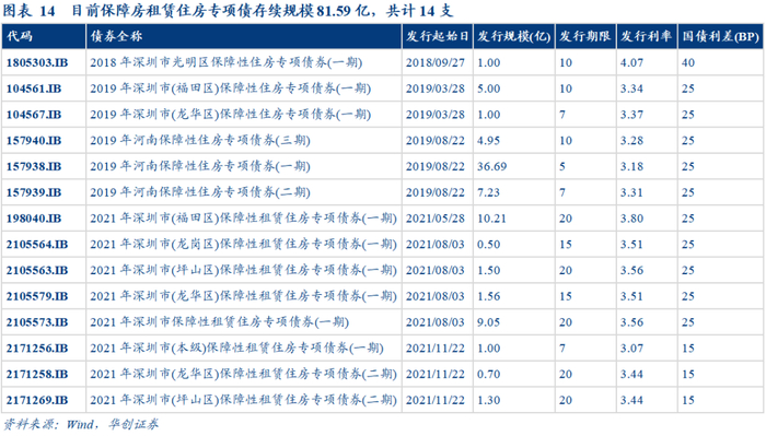 (2)分地区来看,以深圳市为主。在地方积极探索项目收益专项债的进程中,深圳市率先发行保障性住房专项债,目前存续的保障性住房专项债中,也以深圳市为主,14支专项债中有11支由深圳市发行。