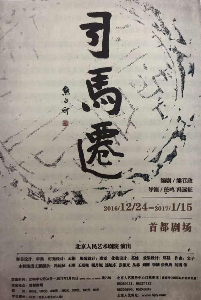 话剧《司马迁》的海报是以题字为主体的,题字者就是编剧本人——茅盾文学奖得主、作家熊召政,该剧由任鸣和冯远征共同执导。郭娜说,将太史公司马迁的故事搬上话剧舞台,是冯远征多年的心愿。