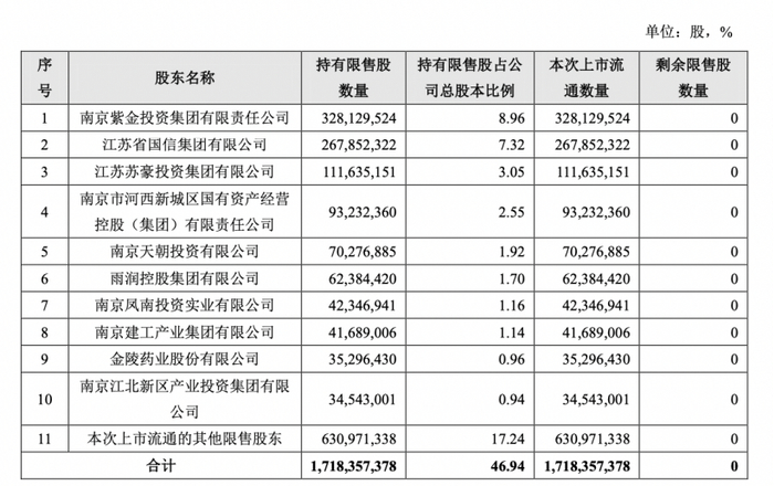 根据保荐机构中信建投出具的核查意见显示,此次共有该行11位股东参与此次限售股的上市流通,其中前三大股东分别为南京紫金投资集团、江苏省国信集团和江苏苏豪投资集团。