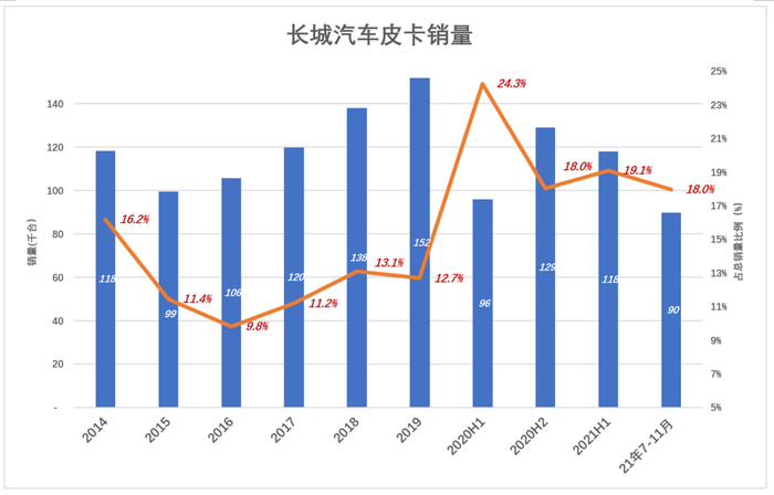 2021年前11个月,皮卡累计销售20.8万台、同比增加2.3%,占总销量的18.6%。但7~11月皮卡显现“疲态”,销量同比下降16.4%。