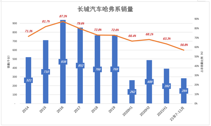 2021年11月,哈弗销量为6.9万台,不及2016年11月峰值的60%。