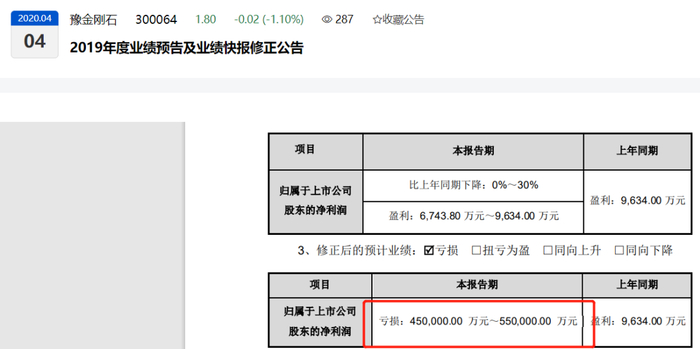 在2020年1月18日发布的2019年业绩预告中,公司预计2019年盈利6743.8万元-9634万元;同年2月29日发布的2019年业绩快报显示,公司2019年盈利8040.34万元。谁知,1个月后,4月4日,公司就发布业绩预告及业绩快报修正公告,预计2019年亏损45亿元-55亿元。对于修正原因,公告称,受新冠肺炎疫情等影响,公司基于谨慎性原则,增加预计负债确认和对存货计提跌价准备,固定资产、在建工程和应收款项计提资产减值准备。