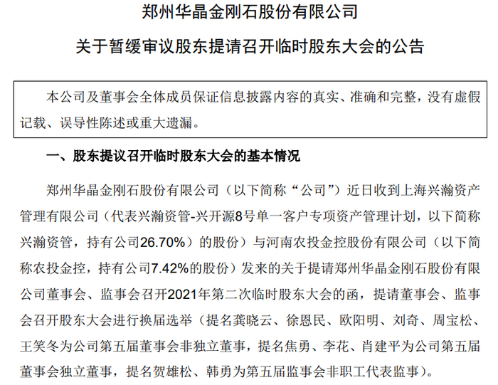 对于暂缓原因,公告称,鉴于公司2021年10月下旬收到的小股东徐柯琴的法律文书,起诉“兴瀚资管管理的资管计划包含农投金控的出资,导致兴瀚资管和农投金控互为一致行动人。在兴瀚资管第一次买入郑州华晶(*ST金刚全称郑州华晶金刚石股份有限公司)股票时未依法进行信息披露,违反了《证券法》第六十三条的规定,因而兴瀚资管第二次买入股票的行为属于违法买入。因此,兴瀚资管违规买入的行为应认定为无效民事行为,其违规增持部分股权也不应享有表决权”。