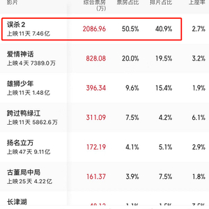 《误杀2》无疑是一匹黑马。猫眼专业版显示,截至12月27日晚8点,《误杀2》上映11天累计票房为7.46亿元,远超同期上映的《雄狮少年》、《跨过鸭绿江》,且实时票房占比、排片占比均位列榜首。