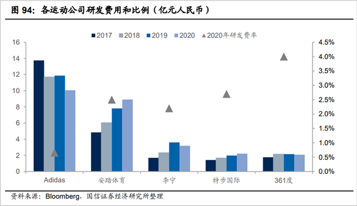 数据显示,四家国货品牌除安踏外,其他三家研发费用净额仅为阿迪达斯的1/3、1/4,这还没将研发投入最大的耐克加进来。