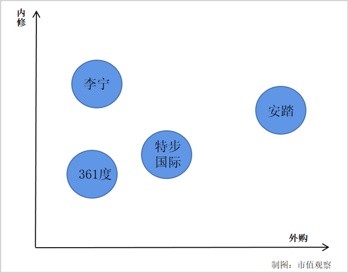 而按照“内修、外购”两个维度对剩余三家国货运动品牌进行排序,可大致分为:特步国际在外购维度领先,李宁在内修维度领先,相对垫底的是361度。