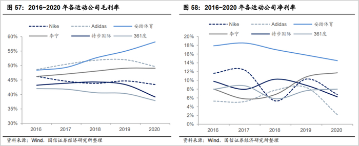 统计数据显示,过去5年,几家头部运动品牌的毛利率保持在45%左右,净利率在10%左右,表现最好的是国产品牌安踏(高端品牌斐乐占比提升),2020年毛利率接近60%,净利率接近16%。