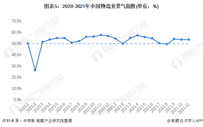近两年来,除2020年2月新冠疫情全球范围爆发,对经济发展和居民生活产生了较大的影响,物流业景气指数骤降至26.2%以外,我国物流业景气指数基本保持在50%以上,2021年11月为53.6%,我国物流业经济整体处于扩张状态。
