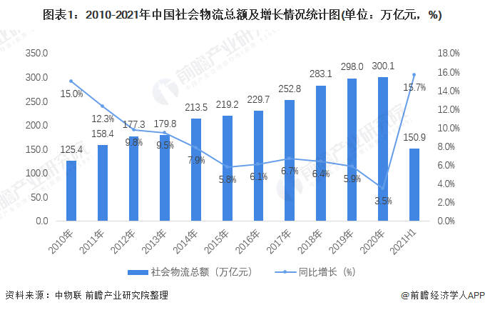 2020年,我国社会物流总额达到300.1万亿元,增速比2019年回落2.4个百分点。从构成看,工业品物流总额269.9万亿元,按可比价格计算,同比增长2.8%;农产品物流总额4.6万亿元,增长3.0%;单位与居民物品物流总额9.8万亿元,增长13.2%;进口货物物流总额14.2万亿元,增长8.9%;再生资源物流总额1.6万亿元,增长16.9%。2021年上半年新冠疫情得到控制,全国社会物流总额实现150.9万亿。