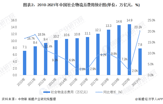 2020年我国社会物流总费用为14.9万亿元,同比增长2.0%。从结构看,运输费用7.8万亿元,增长0.1%;保管费用5.1万亿元,增长3.9%;管理费用1.9万亿元,增长1.3%。2021上半年,社会物流总费用比上年同期增长20.1%,实现7.8万亿元,两年平均增长7.4%,两年平均增速略高于2019年平均水平。