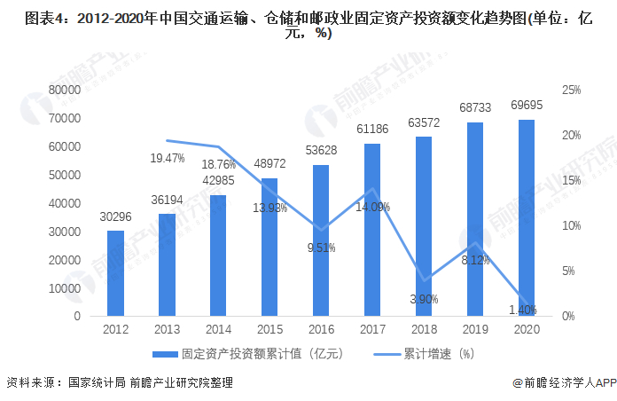 长期以来交通运输设施都是中国重点投资对象,交通运输、仓储和邮政业固定资产投资额逐年上升,但增幅波动收窄。2020年中国交通运输、仓储和邮政业固定投资额累计值达到69695亿元,同比增长1.4%,增幅近八年来最低。2021上半年,全国交通运输、仓储和邮政业固定资产投资额同比增长8.7%。