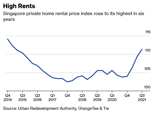 新加坡市区重建局数据显示,2021年第三季度私人租房价格指数飙升至111.3,创2015年第一季度以来最高记录。