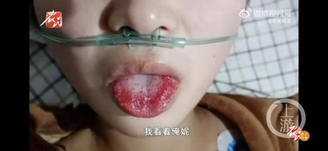 ▲服用百草枯后,萌萌舌头溃烂。图片来源/视频截图