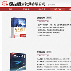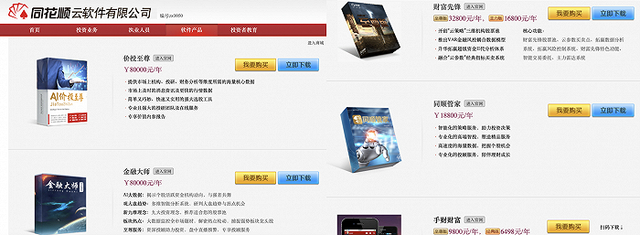 同花顺云官网显示,软件产品包括价投至尊、金融大师、财富先锋、同顺管家以及大研究年费16880元至8万元不等,智能投资管理系统进阶版未500元每月。