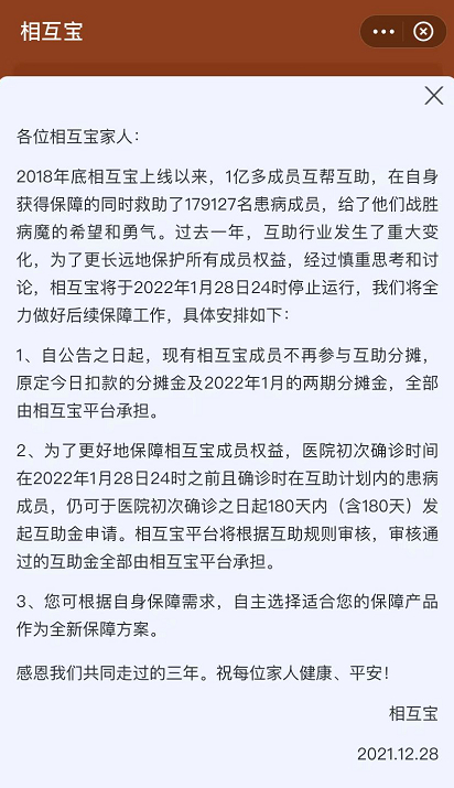 12月28日,相互宝发布公告表示,为更长远保护所有成员权益,经过慎重思考和讨论,将于2022年1月28日24时停止运行。相互宝公告表示,将全力做好后续保障工作,并建议成员自主选择适合的保障产品作为全新保障方案。