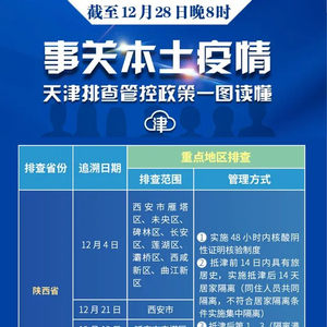 记者12月28日从天津市疫情防控指挥部获悉,目前疫情形势日益严峻复杂,为科学精准、严防疫情反弹,天津市疫情防控指挥部再次更新近期区域排查管控范围,涉及到的相关人员主动向社区、工作单位等报备。