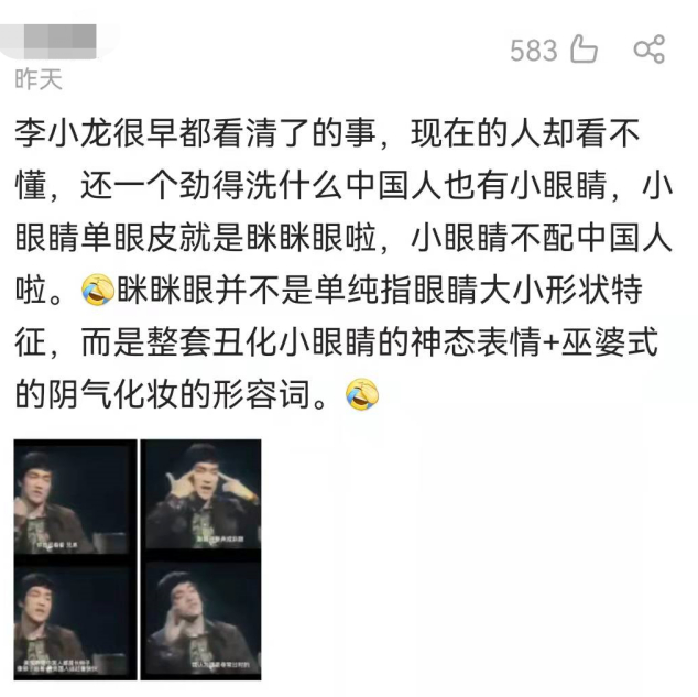 百年来,虽沧海桑田,时过境迁,但始终不变的是“东方主义”者和“自我东方主义”者们,为自己的扭曲与偏见,做掩耳盗铃般的狡辩。他们对“东方主义”审美背后赤裸裸的种族歧视与恶意隐喻视而不见,将西方世界几个世纪以来约定俗成的辱华文化符号偷换概念,简化成“中国人单眼皮、小眼睛”,甚至将今日西方世界都不得不承认是严重的种族主义标志的“眯眯眼”动作歪曲成所谓“传统东方审美”。