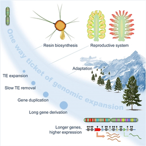 然而,这种严密的监管有一个副作用。“它同时抑制了基于同源重组的重复序列的清除效率,也就是说转座元件一旦复制便很少有机会被清除,因此针叶树的基因组演化进入了一个死胡同—— 一直膨胀。”钮世辉指出,在超剂量转座元件的冲击下,强大的DNA甲基化监管系统是维持基因组稳定性的迫不得已的手段,但同时也“锁死”了基因组缩小通路,造成针叶树基因组的膨胀将仅有一张“单程票”,这可能就是针叶树全部都具有巨大基因组的原因。