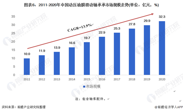 目前国内有40家左右企业涉及动压油膜滑动轴承制造,60家左右的企业涉及轴瓦等轴承配件制造。根据前瞻产业研究院的数据,2020年,中国动压油膜滑动轴承市场规模达到32.3亿元,同比增长8.2%;2011-2020年市场规模的年均复合增长速度为13.9%。