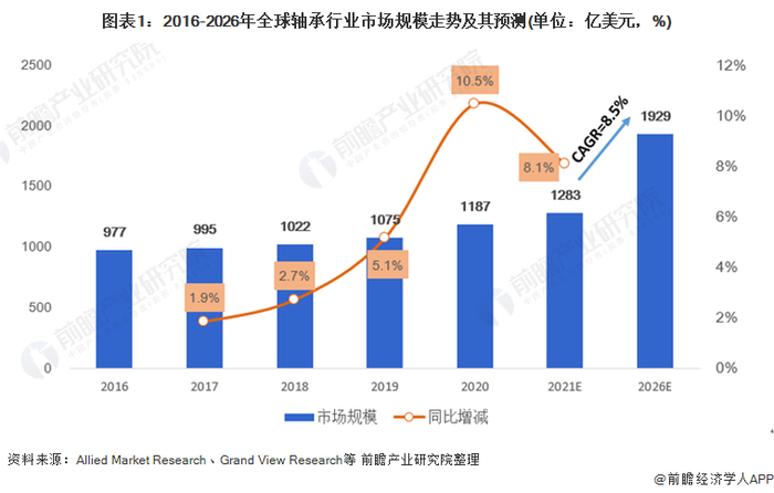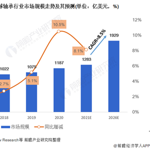 根据Grand View Research等的数据,2020年,全球轴承行业市场规模达到1187亿美元,同比增长10.5%;2021年,预计全球轴承行业市场规模将达到1283亿美元;预计2021-2026年全球轴承行业市场规模年均复合增速为8.5%,到2026年全球轴承行业市场规模将达到1929亿美元。