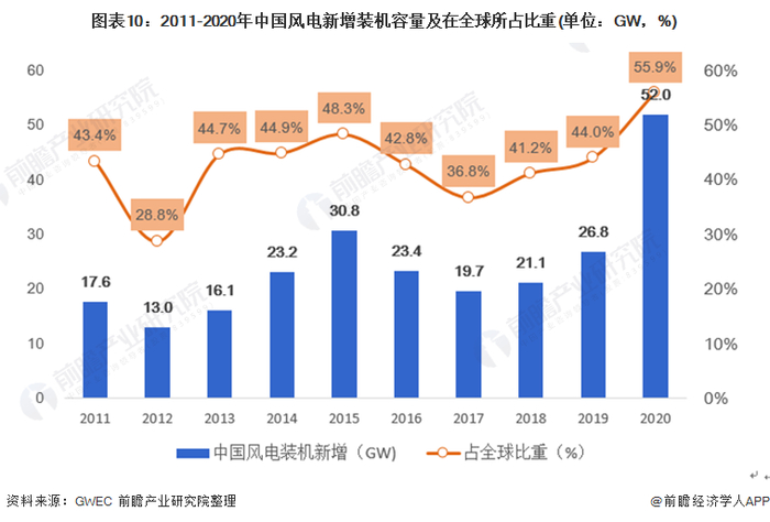 2020年,中国(不包括台湾地区)新增装机容量52.0GW,包括陆上新增风电装机容量48.94GW和海上风电新增装机容量3.06GW。新增装机和累计装机两项数据均居世界第一,新增装机容量在全球比重为55.9%。