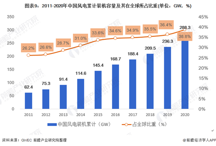中国风电新增、累计装机量连续多年位居全球首位,中国风电已经逐渐成为全球风电行业的领导者。根据全球风能理事会(GWEC)统计数据显示,截止2020年末,我国累计装机容量达到了288.3GW,在全球累计风电装机容量的占比上升为38.8%。