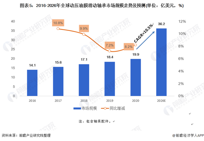 根据前瞻产业研究院的数据,2020年,全球动压油膜滑动轴承市场规模达到19.9亿美元,同比增长8.2%;预计2021-2026年全球动压油膜滑动轴承市场规模年均复合增速为10.5%,到2026年,全球动压油膜滑动轴承市场规模将达到36.2亿美元。
