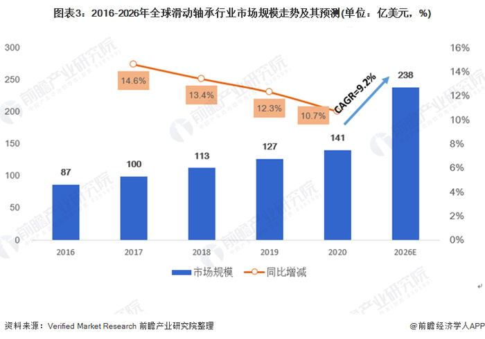 根据Verified Market Research的数据,2019年,全球滑动轴承行业市场规模达到127亿美元。根据前瞻产业研究院的数据,2020年,全球滑动轴承行业市场规模达到141亿美元,同比增长10.7%;预计2020-2026年全球滑动轴承行业市场规模的年均复合增速为9.2%,到2026年,全球滑动轴承行业市场规模将达到238亿美元。