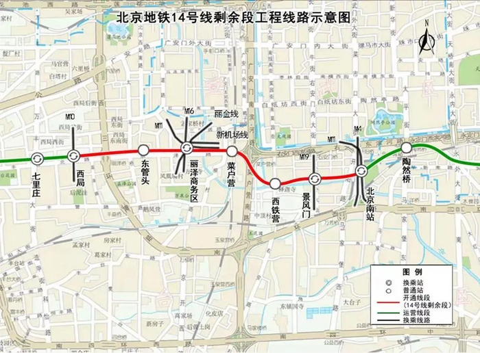 14号线剩余段共开通5座车站,自西向东分别为东管头站、丽泽商务区站、菜户营站、西铁营站、景风门站。按照规划,未来,丽泽商务区站可以实现五线换乘