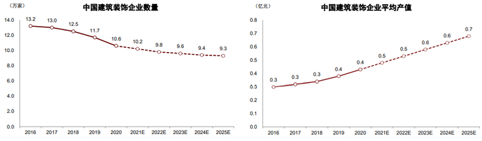 图表9:2020年我国建筑装饰企业共10.6万家,但平均产值仅4000万元