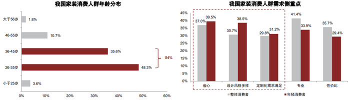 图表6:我国超八成家装消费者为26-45岁的年轻群体,其对省心、风格和定制化等需求维度更加关注