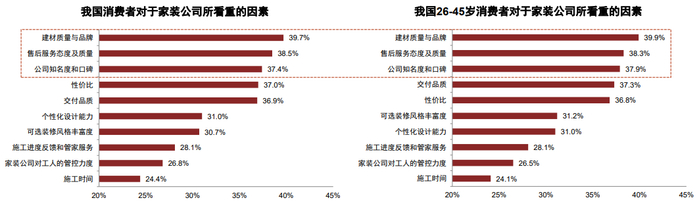 品质依然是家装消费者的首要关注点。根据艾瑞咨询调研结果,“建材质量与品牌”、“售后服务态度及质量”和“公司知名度和口碑”是消费者选择家装公司时最看重的三大因素(图表5),而这三者直接体现为家装服务与交付产品的品质。从调研样本的年龄结构上看,26-45岁消费者对家装公司前三大关注要素的选择与样本整体基本一致,表明家装行业在供应端整体质量不高的背景下,服务与产品的品质问题仍是消费者最为关注的要素。