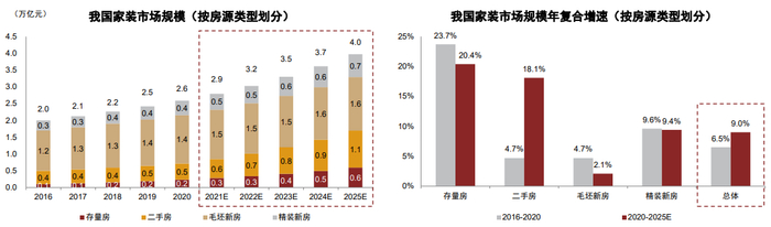 图表1:2020年我国家装市场规模达2.6万亿元,2016-2020年的复合增速为6.5%