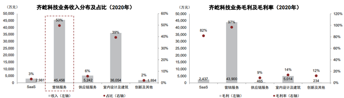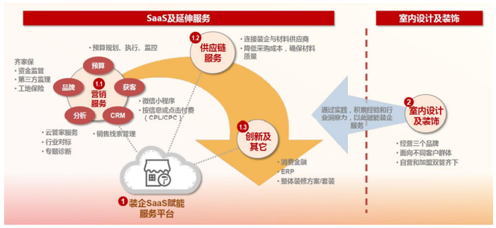 我们以运营齐家网的齐屹科技为例,其业务主要包含SaaS及延伸服务、室内设计建筑及创新业务两大板块(图表21)。其中,SaaS及延伸服务包括向装企提供基于SaaS的整体解决方案(软件服务),以及基于SaaS的营销管理(线上业务支持)和供应链管理(原材料集采与仓配)服务;室内设计建筑及创新业务主要包括由公司经营三个差异化的装修品牌(“齐家典尚”为特许经营模式、“博若森”及“居美”为自营模式),以及向装企提供的一系列创新服务或解决方案。2020年,齐屹科技SaaS、营销服务、供应链服务、室内设计及建筑、创新及其他业务的收入占比分别为3%、50%、6%、39%、2%,营销服务是公司最主要的收入来源(图表22)。
