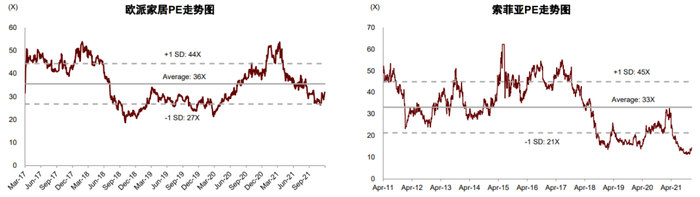 公司业务的产品属性越强,估值溢价越高。国内的家居建材卖场龙头(红星美凯龙和居然之家)的收入主要来源于卖场租户支付的租金和管理费,其历史平均PE处于10-20倍的区间(图表29);反观美国的家居建材零售龙头(家得宝和劳氏),其商业模式为商品采购后进行仓储式零售,历史PE水平在20-30倍之间(图表30);国内的定制家居龙头(欧派家居和索菲亚)作为家具产品制造商和品牌商,其历史PE估值水平在30-40倍的区间(图表31)。未来房企/物企家装业务的估值水平需要依据其具体的商业模式而定。若房企/物企仅参与硬装环节的施工服务,其家装业务的合理估值区间在10-20倍左右;若房企/物企通过交易平台的搭建进一步参与到定制家居、软体家居、家电产品的生产、流通与零售环节,我们认为有望为其家装业务估值提供更高的溢价。