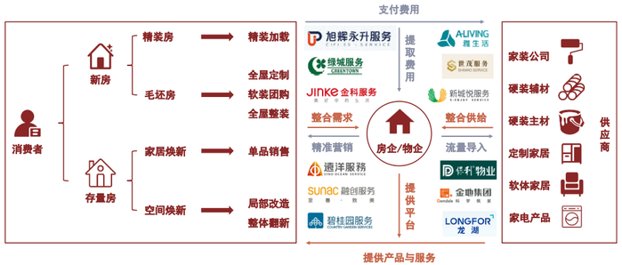 房企/物企当前主要通过独立的平台参与家装业务(多数情况下业务平台置于房企的物业子公司体内),借助自身流量优势(新房预售和存量房物业服务环节)集合消费者需求,并通过与供应商合作的方式(例如战略集采)为消费者提供菜单式的家装服务与家居产品。目前房企/物企主要在家装领域充当交易平台的角色(少数主体通过自营方式开展家装业务),在一定程度上减少了传统家装领域的供应链环节,捕获的价值来源于中间渠道费用的缩减(取代传统的B端经销商)与交易效率的提升(集合C端消费者的大量需求)。长远来看,我们认为房企/物企切入家装领域须至少做到以下几点: